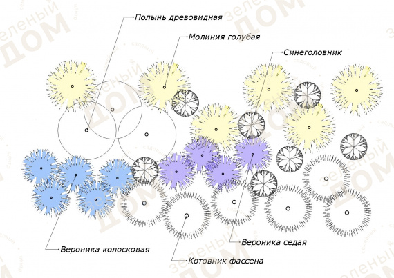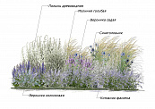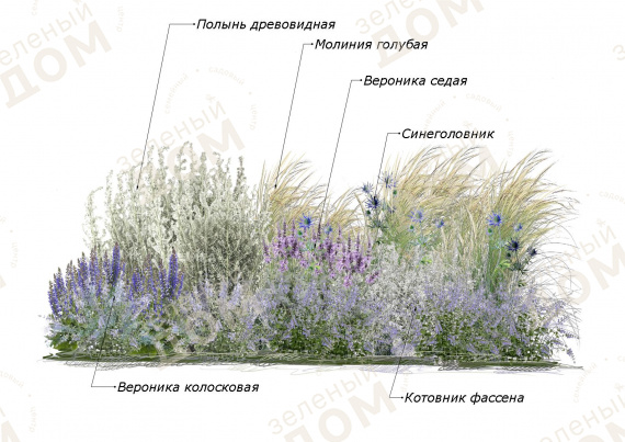 На заднем плане композицию оттеняет Полынь древовидная. Ее потрясающий сизовато-голубой оттенок создает ощущение дымки на заднем плане композиции и идеально сочетается с Молинией голубой.