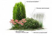 А в качестве фона отлично впишутся конус Туи западной Brabant и плотные кустики Молинии Heidebraut. Примерный размер площади, которая понадобится для этой композиции — 3 на 5 м.